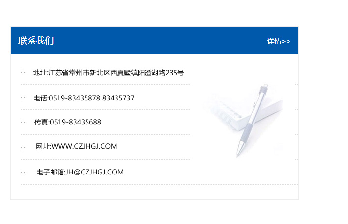 地址:常州市新北區友邦商務大廈1幢16、17層  電話:0519-85101652  傳真:0519-85112595  郵編:213022  網址:www_cz-jiayue_cn.lyt88.com  郵箱:xiajifengaa@163.com